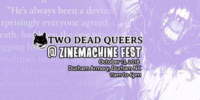 I will be attending ZINE MACHINE 4 at the Durham Armory in Durham, NC on October 13, 2018 with my partner under our joint brand, Two Dead Queers!