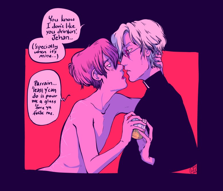 a glass A short comic illustration of characters Jehan and Tiefer, who appear in the Obscene Sacraments series, {familia}, “Can’t“ from NANSENSU #2, and other stories. Clip Studio Paint EX | 27 Aug 2019