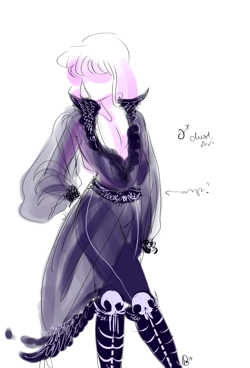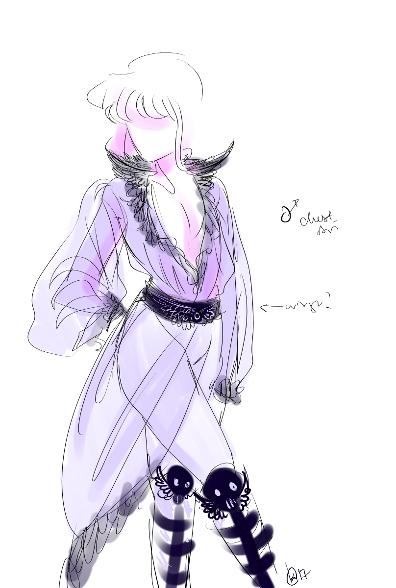 I want something that will translate to black and white/greyscale fairly well and I like the flowy little see-through shawl in the initial sketches but I’m thinking something more substantial. I also want a feather motif which the collared, soldierly waist coat definitely captures.