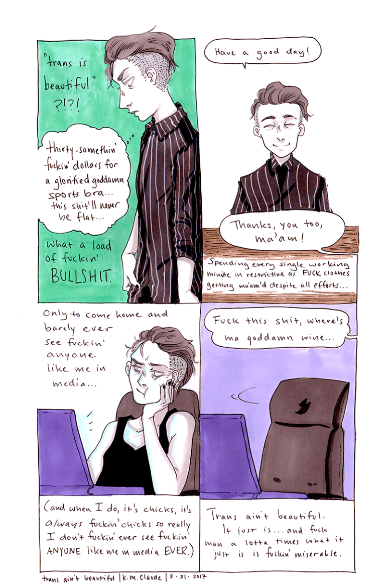 These comics will be based on experiences and thoughts I’ve had regarding life, and its many struggles, including those of gender, sex, mental illness, and everything in between. I am hard on myself both as a protective measure (life can’t hurt you if you beat it to the punch) and as a result of my mental issues. As a result, the language is and often will be blunt, aggressive, shocking, and sometimes painful; similarly, my humor is often dry, self-deprecating, and dark. I write the way I speak and definitely the way I speak to myself which is not often nice.