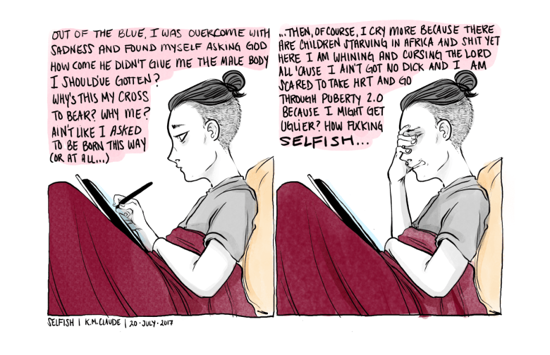 These comics will be based on experiences and thoughts I’ve had regarding life, and its many struggles, including those of gender, sex, mental illness, and everything in between. I am hard on myself both as a protective measure (life can’t hurt you if you beat it to the punch) and as a result of my mental issues. As a result, the language is and often will be blunt, aggressive, shocking, and sometimes painful; similarly, my humor is often dry, self-deprecating, and dark. I write the way I speak and definitely the way I speak to myself which is not often nice.