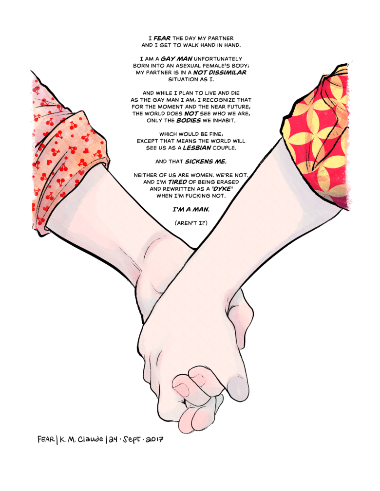 These comics will be based on experiences and thoughts I’ve had regarding life, and its many struggles, including those of gender, sex, mental illness, and everything in between. I am hard on myself both as a protective measure (life can’t hurt you if you beat it to the punch) and as a result of my mental issues. As a result, the language is and often will be blunt, aggressive, shocking, and sometimes painful; similarly, my humor is often dry, self-deprecating, and dark. I write the way I speak and definitely the way I speak to myself which is not often nice.