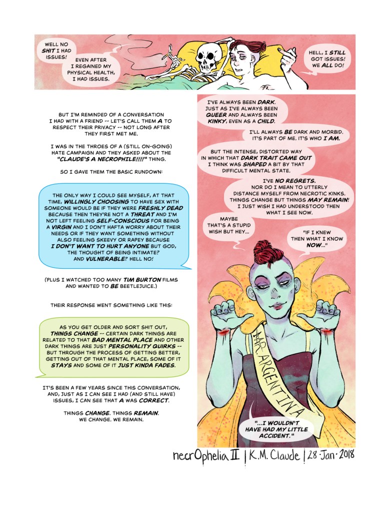 And things remain. I love the gothic. I find Poppy Z. Brite’s Exquisite Corpse to be insanely erotic. Victoria Elizabeth Black’s cannibal necrophiliac floorshow on the finale of Dragula is transcendent. My favorite musical is about a love affair with Death for Chrissakes! Morbidity, darkness, and a sexual danse macabre are all aesthetic and artistic interests of mine — always have been, always will be. And that’s where another difficulty came in on this comic: I never want to throw kinky or alternative people under the bus or to even come off like that, like I’m sitting high and mighty on a throne going “so long suckers, I’m NORMAL now unlike you deviant freaks!” or something because that’s not the case. That’s far from the case. I just hope that that is indeed conveyed because this world’s hard enough to get through without the added weight of feeling like a freak.
