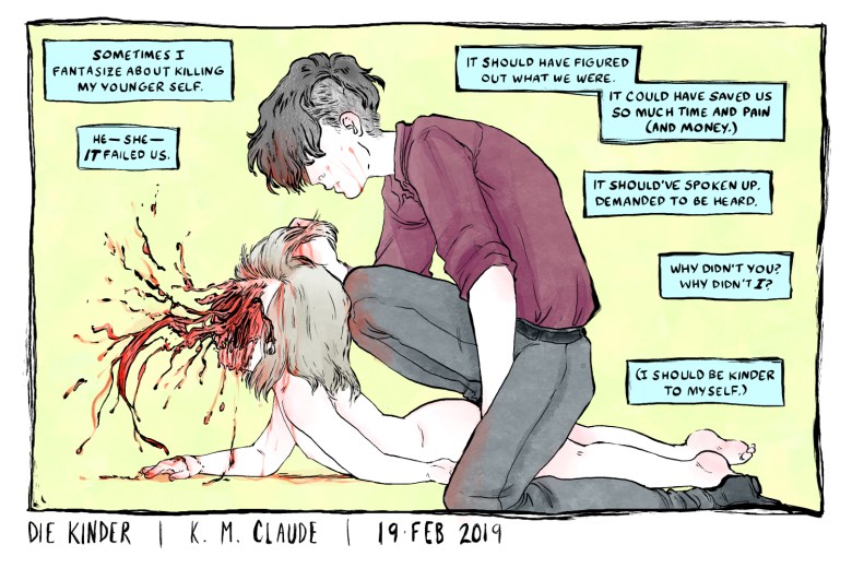 These comics are based on experiences and thoughts I’ve had regarding life, and its many struggles, including those of gender, sex, mental illness, and everything in between. As a result, the language is often blunt, aggressive, shocking, and sometimes painful; similarly, my humor is often dry, self-deprecating, and dark. I write the way I speak and definitely the way I speak to myself which is not often nice.