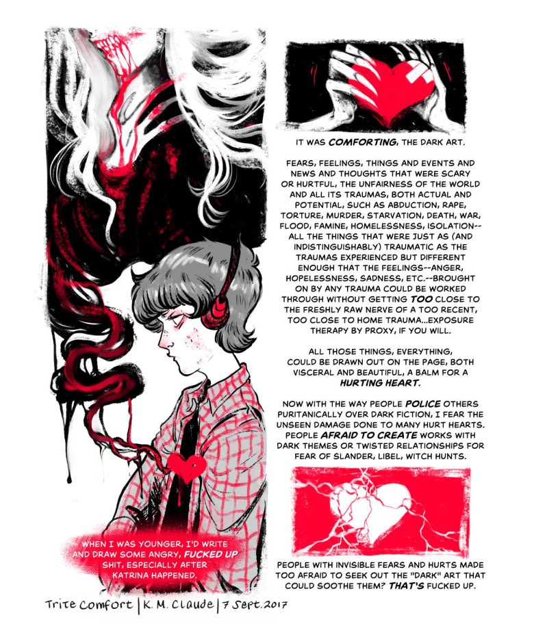 I debated on sharing these or keeping them eventually book exclusive; however, I feel they need to be shared because right now I’m going through a bad mental health time and it used to be that when I did, I could use art to purge feelings through art utterly divorced from myself and my morality and then share that art with others who understood the basics of how art and catharsis worked and we all benefited: people got art and I had an outlet for emotions. Now though with the way things are I am suffocating under the weight of emotions and feelings and crippled mental health because there’s nowhere for it to go and I know I’m not alone. Other artists are suffocating too. Man cannot live on sugar-y sweet uplifting art alone…