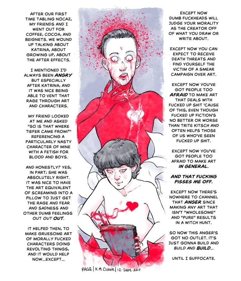 I debated on sharing these or keeping them eventually book exclusive; however, I feel they need to be shared because right now I’m going through a bad mental health time and it used to be that when I did, I could use art to purge feelings through art utterly divorced from myself and my morality and then share that art with others who understood the basics of how art and catharsis worked and we all benefited: people got art and I had an outlet for emotions. Now though with the way things are I am suffocating under the weight of emotions and feelings and crippled mental health because there’s nowhere for it to go and I know I’m not alone. Other artists are suffocating too. Man cannot live on sugar-y sweet uplifting art alone…