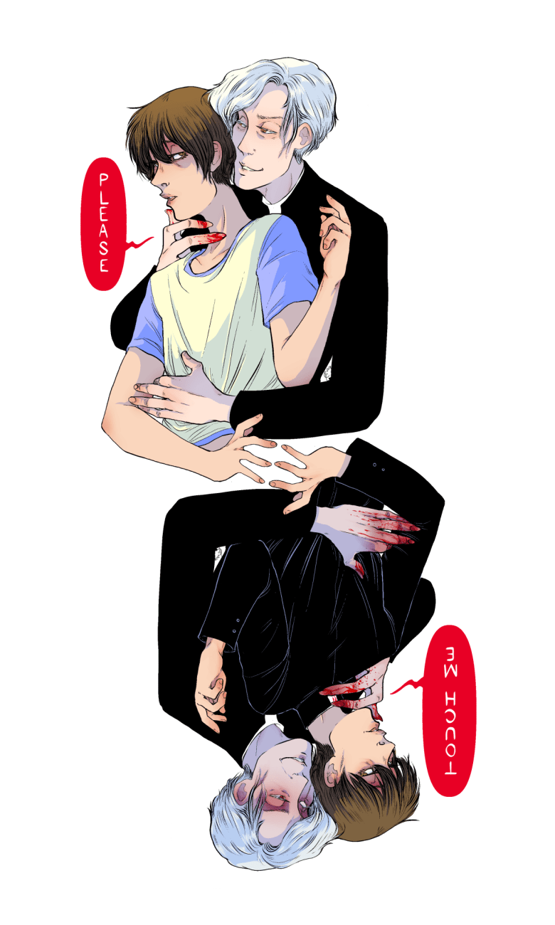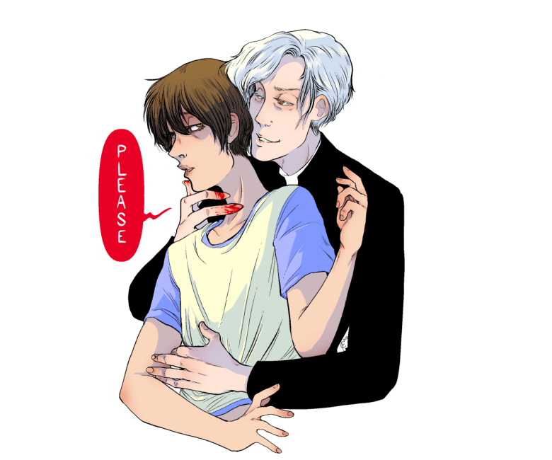 Illustration-comic featuring two characters, Jehan and Tiefer, from many of my works, including First Holy Cummunion and Other Obscene Sacraments, {familia}, “Can’t”, and “Monster”.