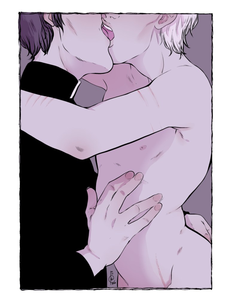 a redraw of a 2015 piece of my characters Jehan and Tiefer, featured in works such as “Human”, “Can’t“, QUARANZINE, and the Obscene Sacraments series, but where their roles’re swapped