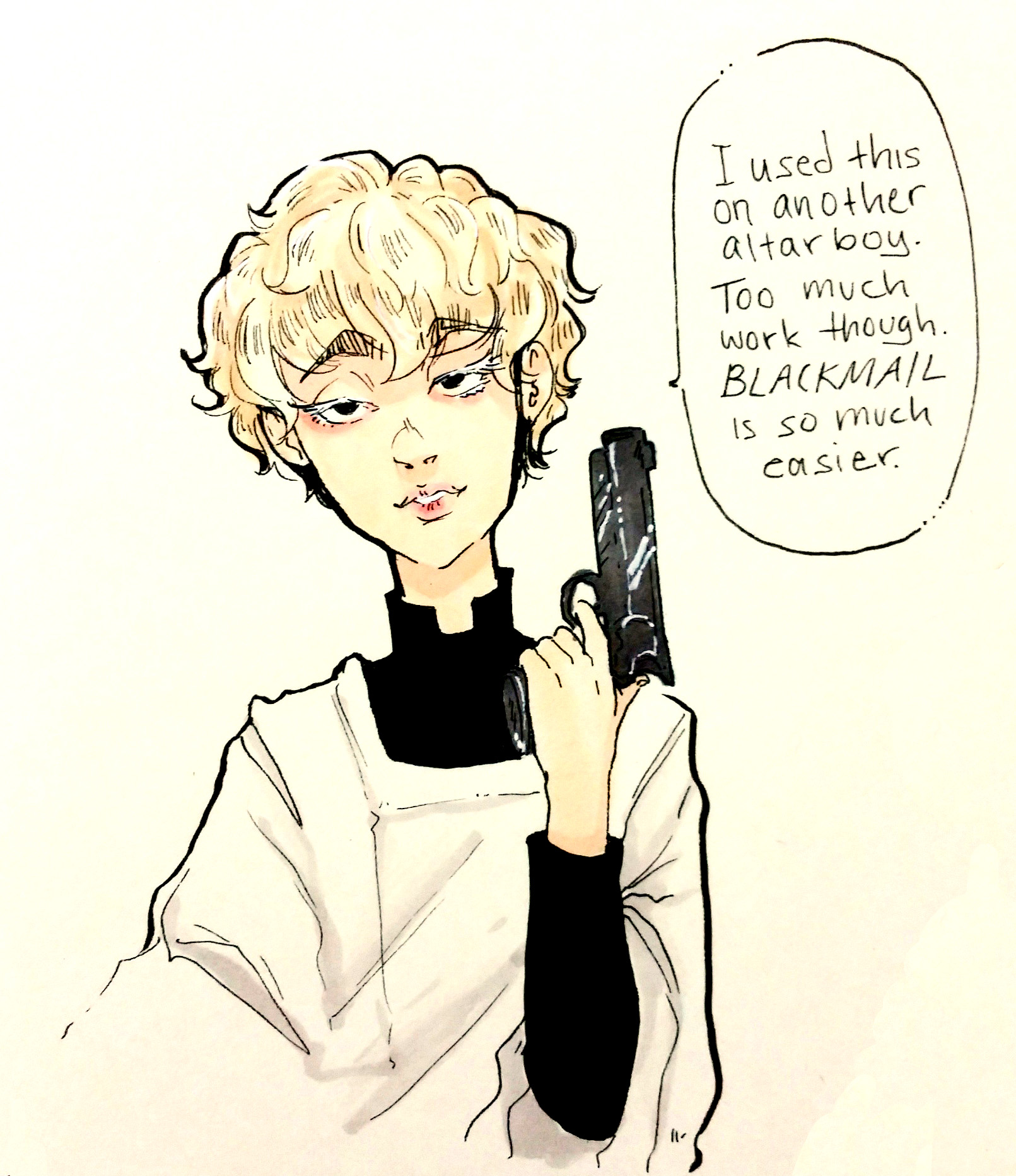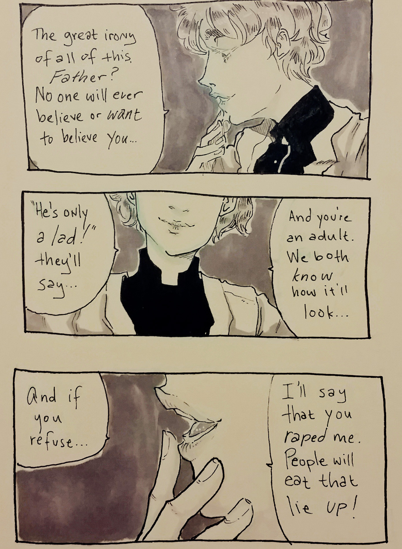 Developmental sketches and comics of a character from an upcoming project. This story will be about public perception of who “can” or “cannot” rape or be raped. Obviously, of course, anyone can commit a crime and it would be foolish to think otherwise; however as a society we tend to have a problem conceiving of or accepting — for whatever reasons be they stereotypes or denial or whathaveyou — that certain demographics can commit certain crimes. In fact, that problem is why for the longest time we as a society assumed and in some cases still, horribly enough, assume that a woman cannot rape a man.