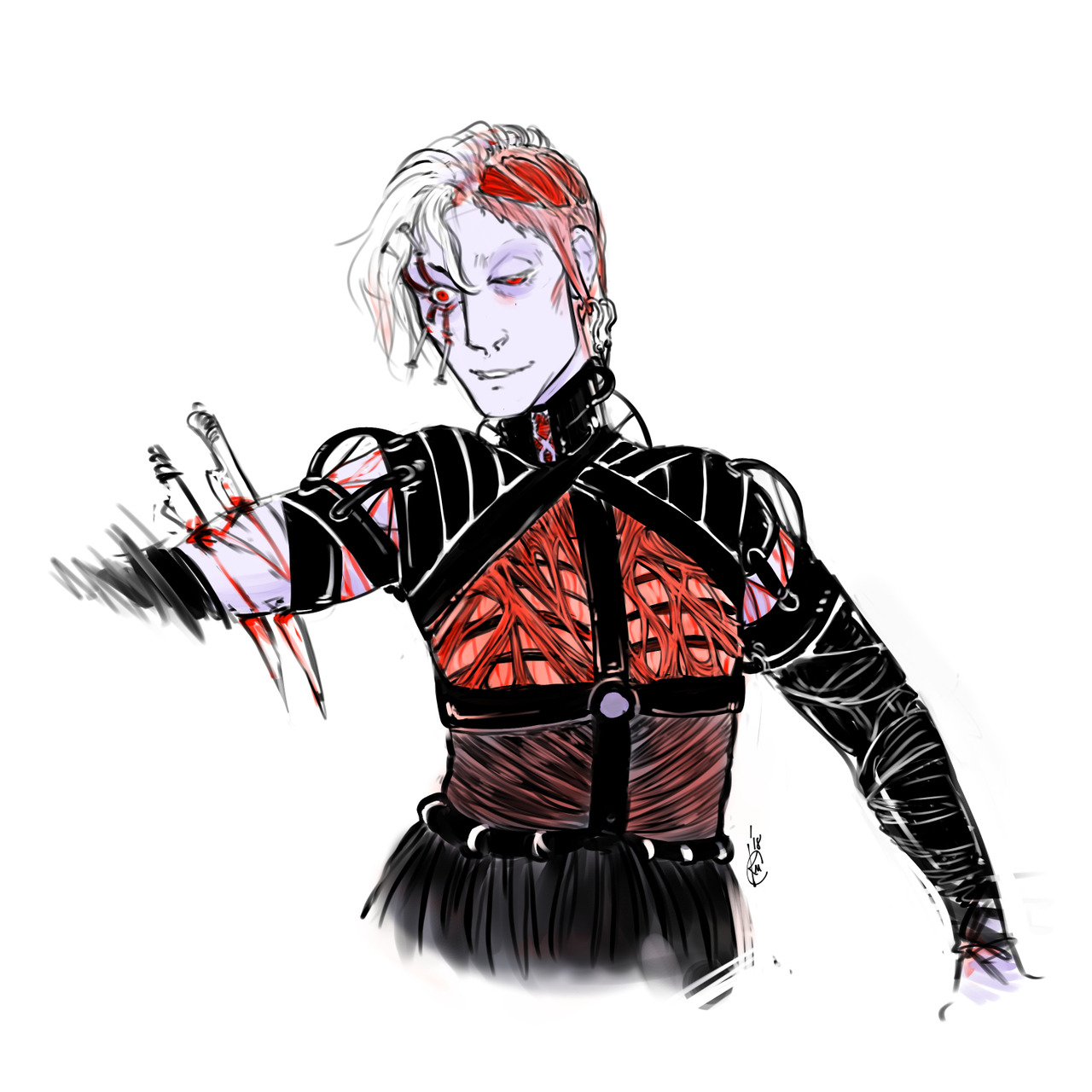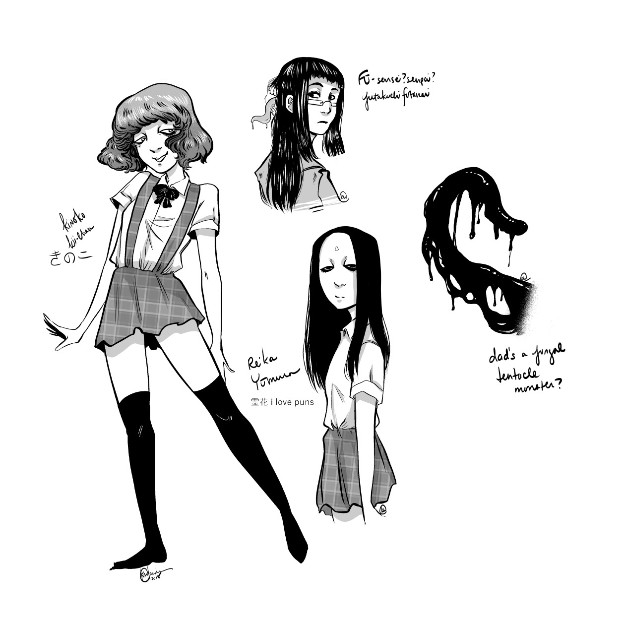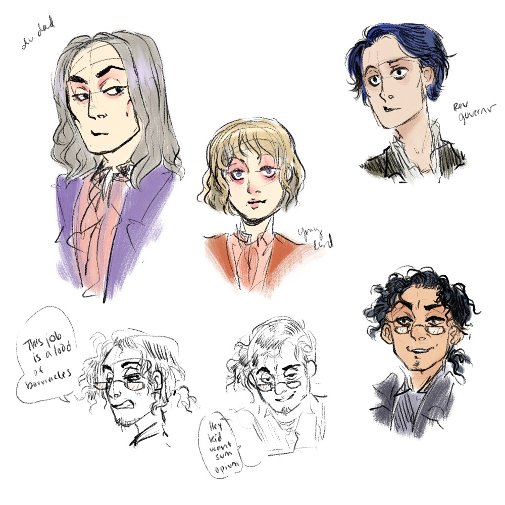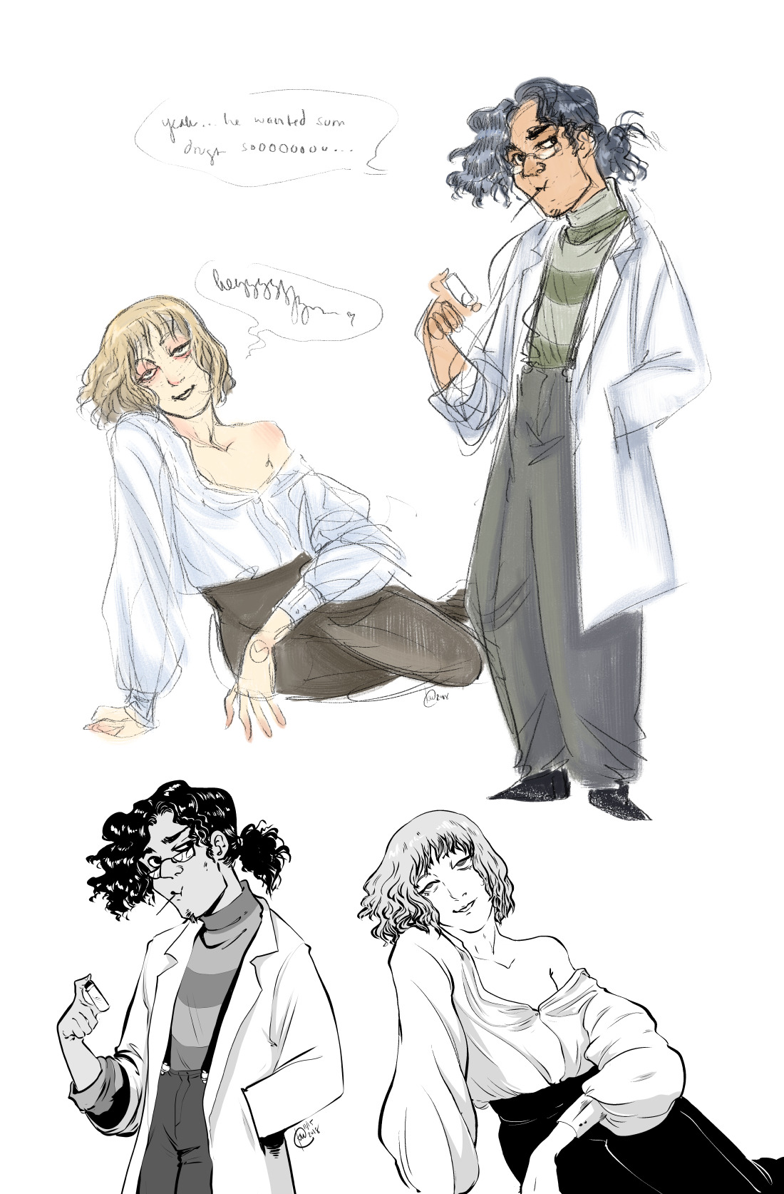 Miscellaneous sketches posted on social media from this year, including some character design concept art: one for a horror-erotica comic featuring monster girls and another for a Victorian-ish BL comic.